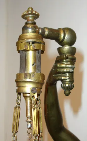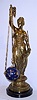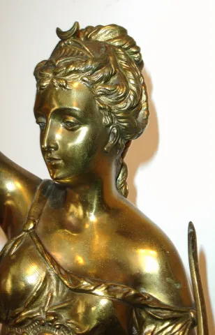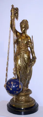 French, bronze figure of Diana with bow, from which is suspended via three chains, a ball containing the movement, which travels in a circular / conical pattern motion when running, striking on bell, c1885