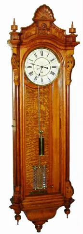 Seth Thomas Clock Co., Thomaston, Conn., "Regulator No. 19" wall clock 8 day time only weight driven movement with Mercury two-jar pendulum in oak case with burled highlights on top crest and raised burled panel on backboard with painted metal dial, c1886