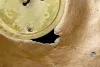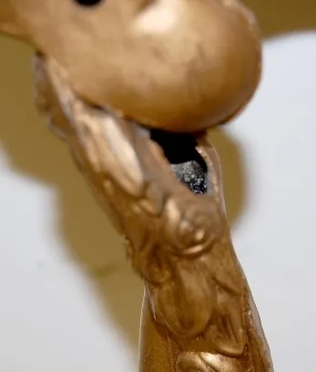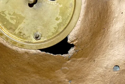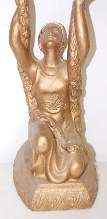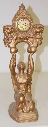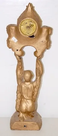 key wind; 2 1/8" marked gold colored dial with Arabic numerals; lady kneeling and holding up an arch with clock and candle/light holders; may have bee...