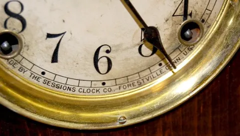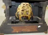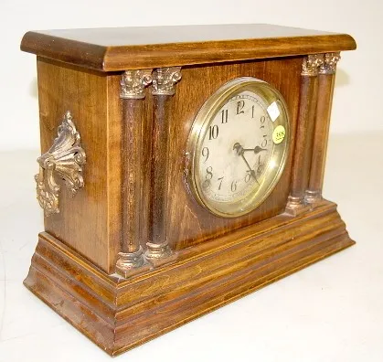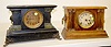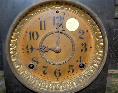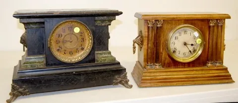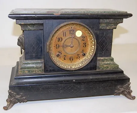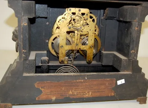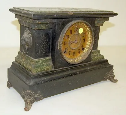 1.) Seth Thomas adamantine black enamel; 8 day time and strike; 4 1/2" marked paper dial; has pendulum; no key; marked movement. (Dial very dark; no g...