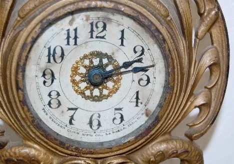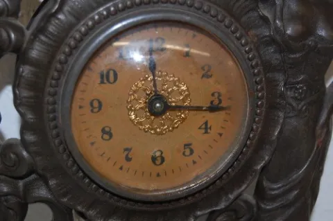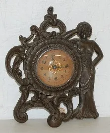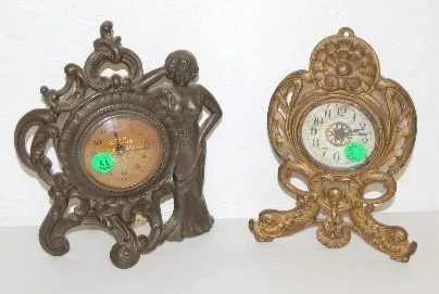 1.) Iron Lady standing figural dresser clock; bell strike. 2.) Western Clock Co.; dolphin, shell and cattails; iron clock; running. 8 3/4" Tallest...
