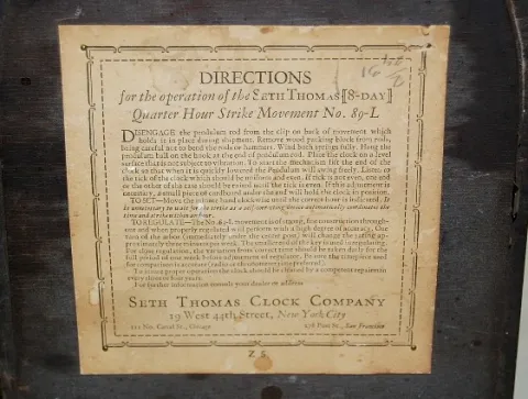 8 day time and 2 bar quarter hour strike; 5" marked metal dial; marked movement; convex glass; directions inside back door; inlaid case with Greek key...
