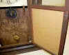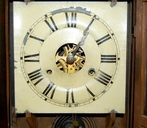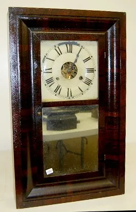 8 day time and strike; 8 1/2" painted metal dial; has pendulum and 2 weights; no key; mirror lower door; good interior label; not tested for running c...