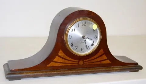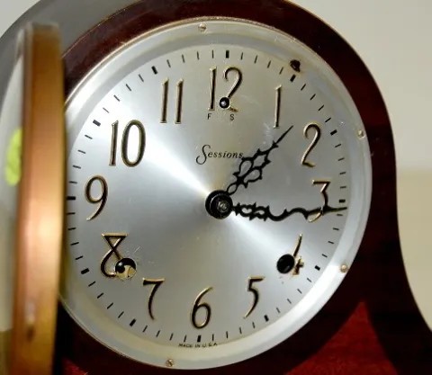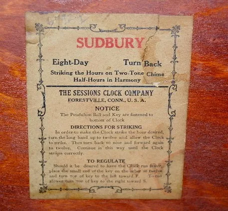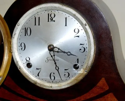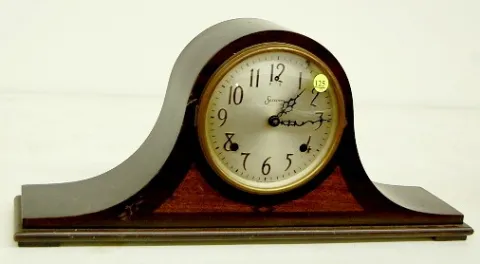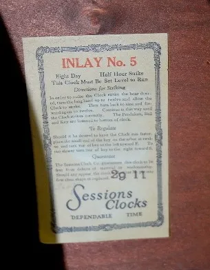 1.) Sessions Mahogany Inlay No. 5 Tambour Clock: 8 day time; 1 bar hour and half hour strike; 4 1/2" marked metal dial; Patent No. 1704866 marked on m...
