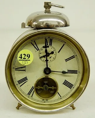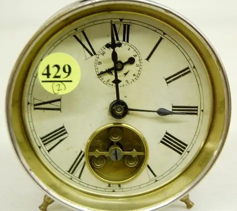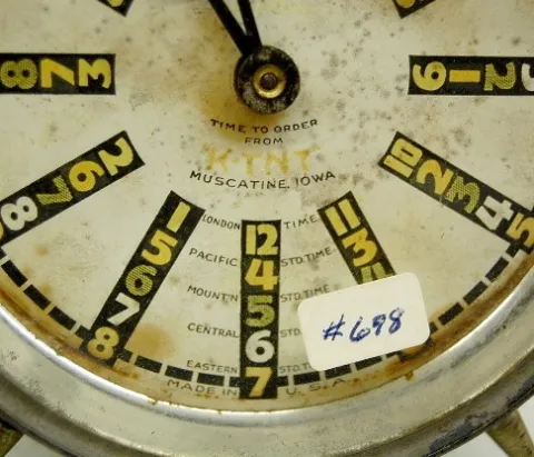 1.) Unmarked paper dial with 12 hour alarm; key wind, bell top; identified by owner. Not running. 2.) Paper dial Marked "Time to Order From K-TNT, Mus...