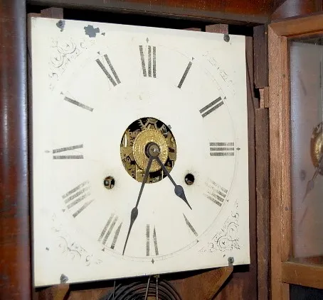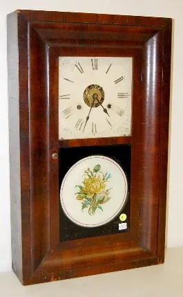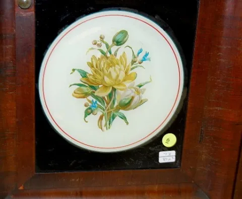 time and strike with alarm; 8 3/4" metal painted face; has key and pendulum; no weights; floral painted lower door; good interior label; not tested fo...