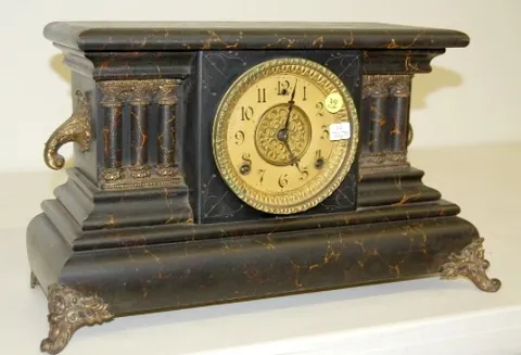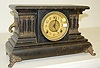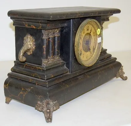 8 day; time and strike; cathedral gong with half hour bell strike; 4 1/2" marked paper dial; has key and pendulum; black marbleized case with 3 column...
