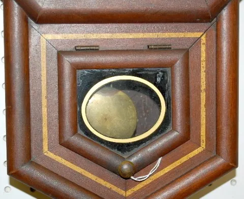 time only; keyhole between 4 and 5; has key and pendulum; 9 1/2" marked painted tin dial; direction label inside; key winds; not tested for running co...