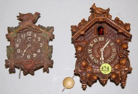 1.) Keebler with 2 parrots, Colonial dressed couple and flowers; complete with weights and pendulum, no key. 2.) 2 Keebler bird with nest and grape le...