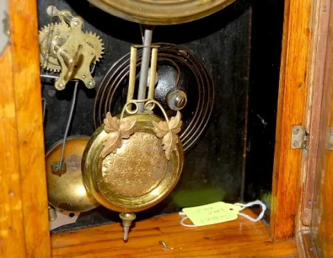8 day time and strike with alarm; 5" marked paper dial on tin; has key and pendulum; floral decorated glass door; paper label on the back; winds and r...