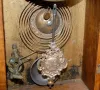8 day time and hour and half hour strike with alarm; 5" unmarked painted tin dial; has pendulum; no key; gold vase of flowers decorated glass door. (R...