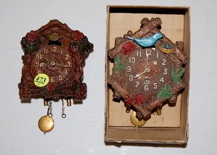 1.) Bluebird with red flowers, original box, complete with weights and pendulum, no key. 2.) Multi-color bird with red flowers, complete with weights ...