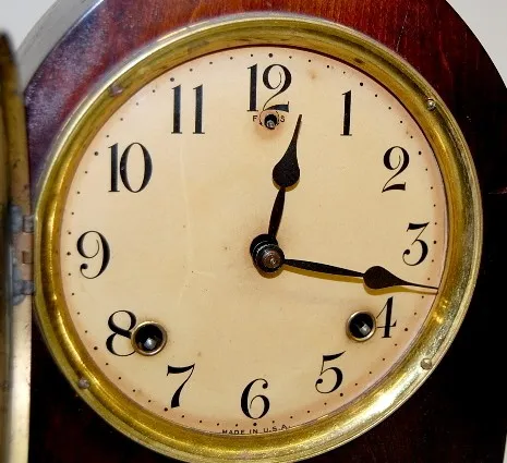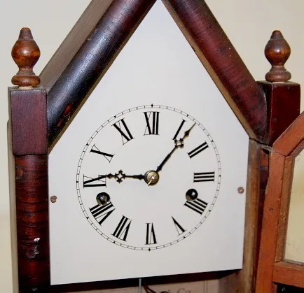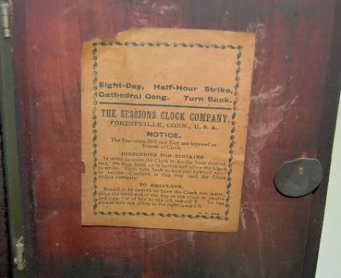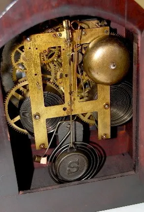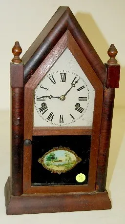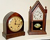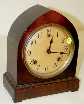 1.) Sessions Mahogany Tombstone Mantle Clock: 8 day time and strike; hour and half hour strike; 5 1/2" metal dial, marked Made in U.S.A.; unmarked mov...