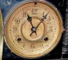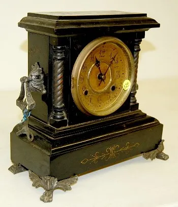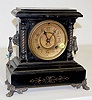 8 day time and strike; hour and half hour gong strike; 4 1/2" unmarked metal dial; has pendulum; no key; black iron with cast metal trim and winged pa...