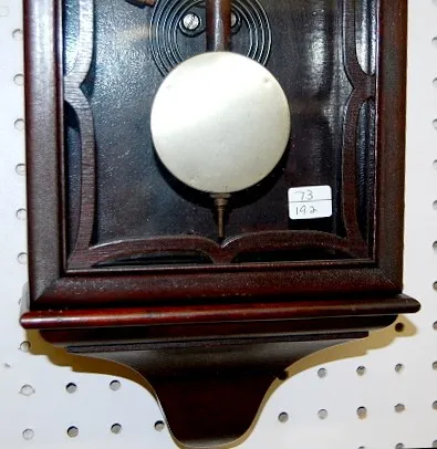 time and strike; 5 1/2" marked metal dial; has key and nickel trim and pendulum; not tested for running condition. (Dial has a few scratches on it.) 2...