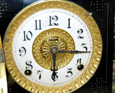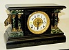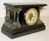 8 day time and strike; hour gong half hour bell strike; 4 1/2" marked paper chapter ring on tin; has pendulum; no key; black enamel case with marbleiz...