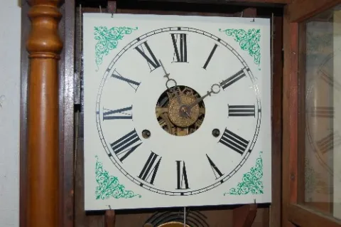 with alarm, weight and pendulum. (New dial, door wood replaced.) This lot is in rough, as is, as found condition....