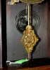 time and strike; 5 1/4" marked Made in U.S.A. painted tin dial; has pendulum; no key; half hour gong strike; painted glass; winds and runs. 23"...