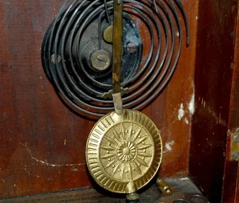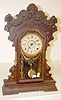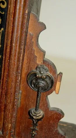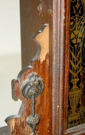 time and strike; 5 1/2" marked paper dial on tin; has key and pendulum; urn and swag decorated glass door; not tested for running condition. (Pendulum...