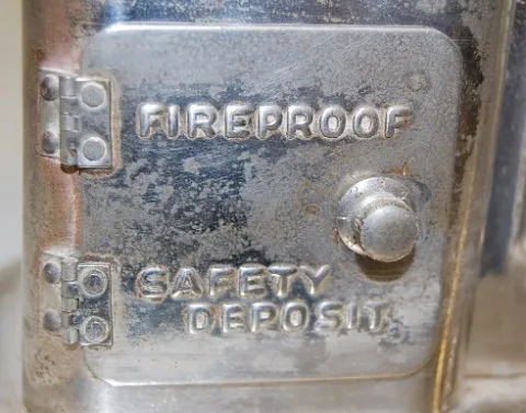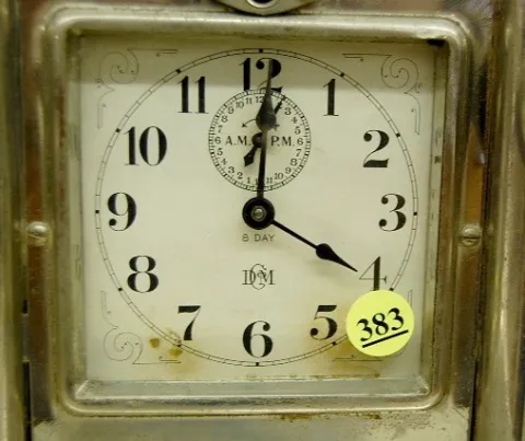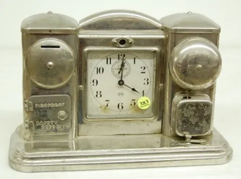marked paper dial with 24 hour alarm; case marked "Made by Darche Mfg. Co. Chicago"; one side of case is a battery box and alarm, the other is a place...