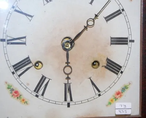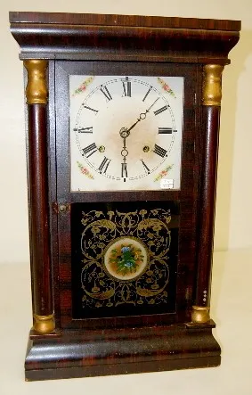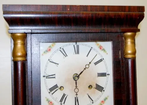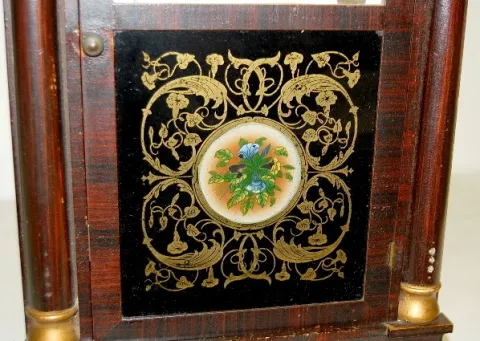 time and strike; has key, pendulum and weights; paper dial; bottom glass has blue floral center with gold leafy vine; good interior label; not tested ...