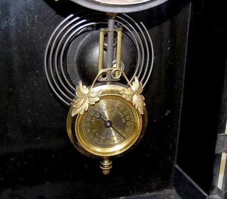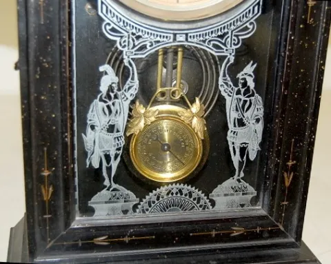 8 day; time and strike; 5" unmarked paper dial on tin; has key and pendulum; hunter and fisher decorated glass door. (Winds and runs for a little whil...