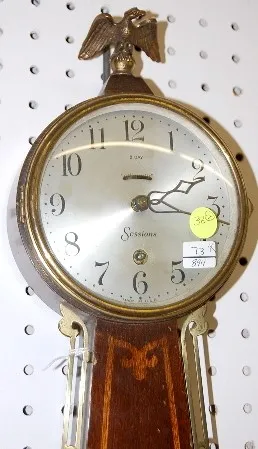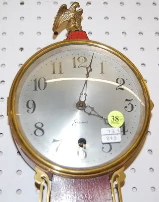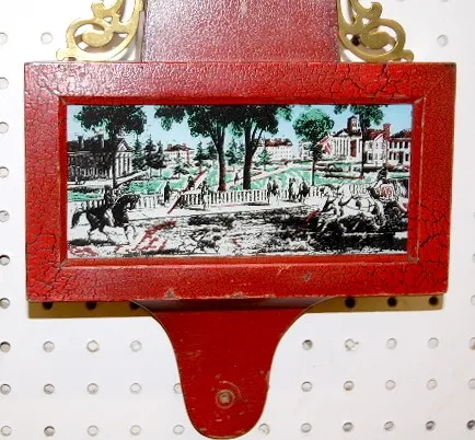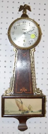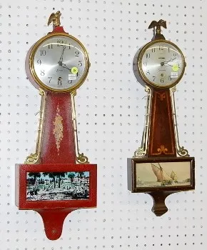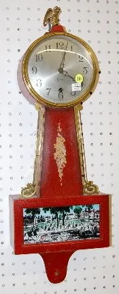 1.) Time only; marked metal dial; has pendulum; no key; eagle finial; red crackle finish with Victorian street scene tablet; not tested for running co...