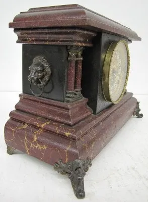 red faux marble painted; lion heads; T and S; fancy dial. 12" x 18"...
