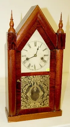 1.) New Haven steeple clock; time and strike; painted tin dial; has key and pendulum; gold decorated door; interior label; not tested for running cond...