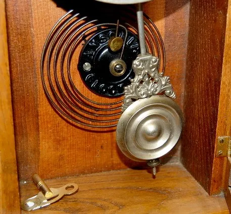 1.) New Haven Black Walnut "Celeste" Mantle Clock: 8 day time and strike; cathedral gong on the hour; 5" unmarked painted tin dial; has key and pendul...
