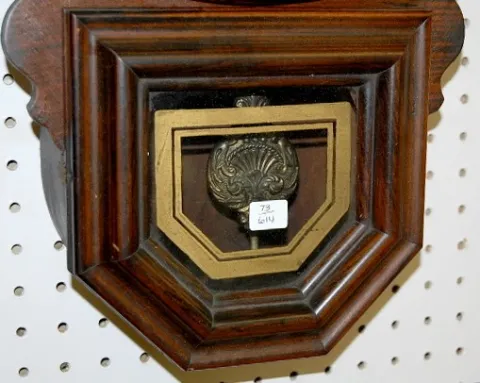 keyhole between 6 and 7; 11 1/4" painted tin dial; has key and pendulum; painted lower door. (Key fits loosely; does not wind; dial worn and faded; mi...