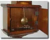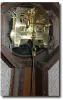 Nearly three feet long, solid walnut case featuring a five an half inch silvered dial. Much like Howard Miller (but substantially smaller) George Lippert of Kitchener, Ontario made high quality copies of older American clocks, and specialized in banjos. Although not positive, I believe he operated through the 50's and 60's. Complete with his original label, old cast eagle, nice bezel and glass, this is an outstanding example of his work. German eight day time and strike, with a nice deep strike on a long vertical rod, heavy pendulum...recently serviced and in good running order with key.
