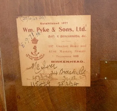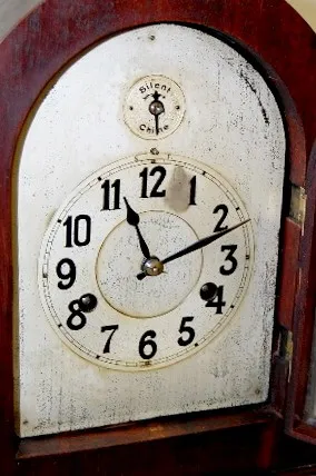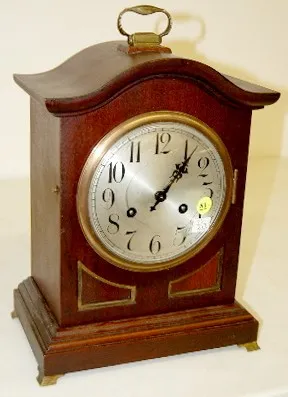 1.) Junghans Cabinet Clock: time and strike; marked movement Junghans B12; unmarked 6" metal dial; has key and pendulum; beveled glass. (Runs for a li...