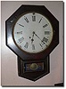 Early Schoolhouse SIZE: Seventeen inch octagon, overall height twenty three inches. CONDITION: Solid case, wee bit of veneer lifting and a couple very small spots of veneer loss. Excellent original tablet, even has the old putty holding in the glass! DIAL: Original painted metal dial, numbers have been touched up. MOVEMENT: Early pinned unsigned (but looks American) eight day time only, in good running order with pendulum and key.