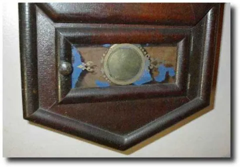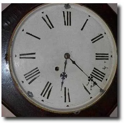 SIZE: Seventeen inch octagon, overall height twenty three inches. CONDITION: Solid case, wee bit of veneer lifting and a couple very small spots of veneer loss. Excellent original tablet, even has the old putty holding in the glass! DIAL: Original painted metal dial, numbers have been touched up. MOVEMENT: Early pinned unsigned (but looks American) eight day time only, in good running order with pendulum and key.