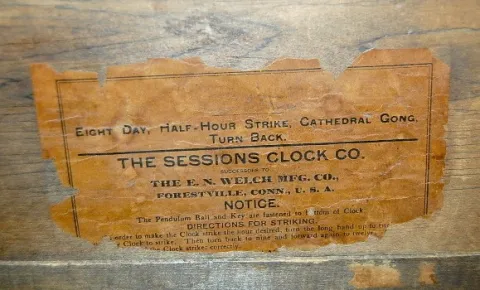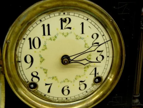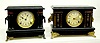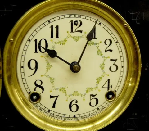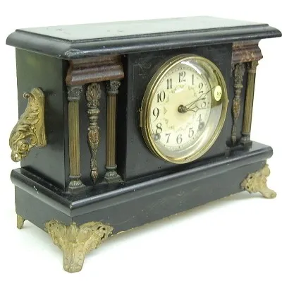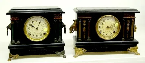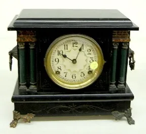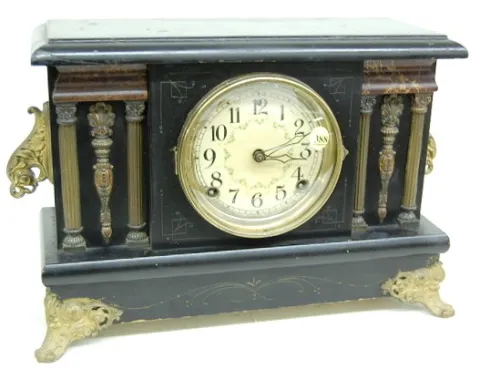 1.) "Celtic", 8 day time and strike; decprated and marked ivoroid dial; no key or pendulum; convex glass. Black enamel painted with marbleized accents...