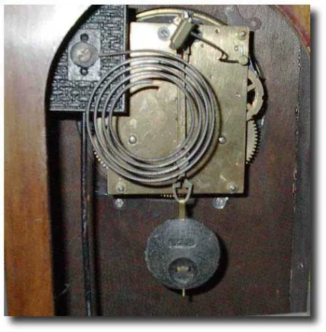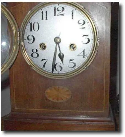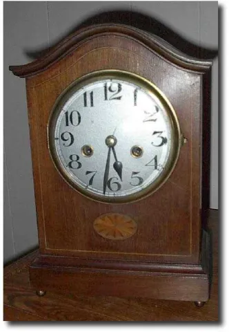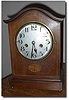 Very nice case about eight inches wide and thirteen inches high, featuring rounded arch top and nice inlay on front. Extremely nice dial with original...