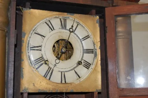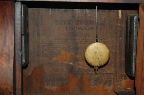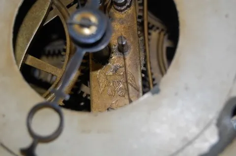2 weights; T and S; key and pendulum. (Rough case and glass.) This lot is in rough, as is, as found condition....