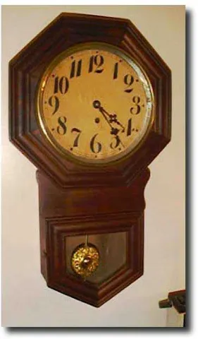 Schoolhouse Regulator SIZE: Twenty four inches long, fifteen inches wide. CONDITION: Not a present day Japanese reproduction, rather this is an imported clock from Japan, c1970 or so. Nice looking wood case, shows very well. Original bezel and glass. DIAL:Original paper dial, slightly discolored and a bit loose in a couple of places, but still shows very well. MOVEMENT: Eight day time only, in good running order with fancy pendulum and key.