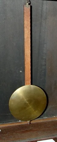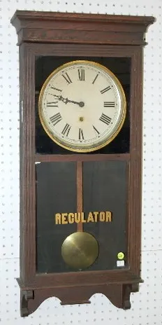 time only; 10" marked paper dial; has pendulum; "Regulator" painted on bottom glass; key does not wind; not tested for running condition. 35 1/2"...