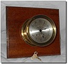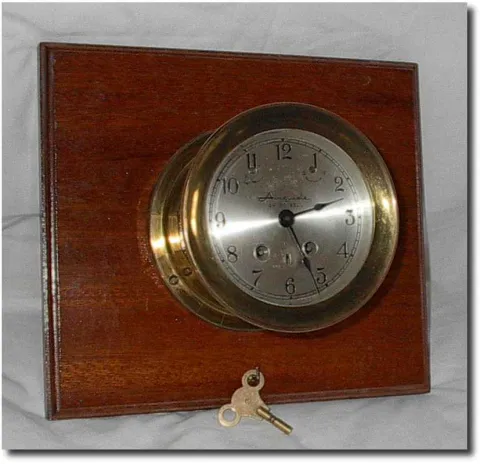 Ship's Bell Strike the "watch" progressively through each four hour segment. This one is complete with original mounting board, about ten inches square. Brass clock is about five inches in diameter, three and half inches deep. Original mounting board about ten inches square. Label on back of board reads "Atlantic Aero Marine, Dartmouth NS" and dial of clock reads"Airguide". Eight day, with s/f and shutoff on dial, in good running order. Pretty nice dial with bevelled glass. Brass side section do show some slight stress marks, but not that noticeable.