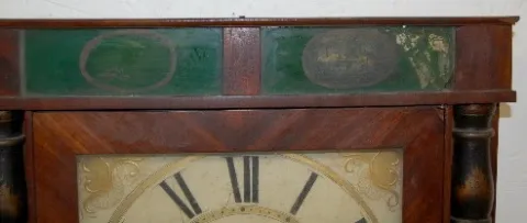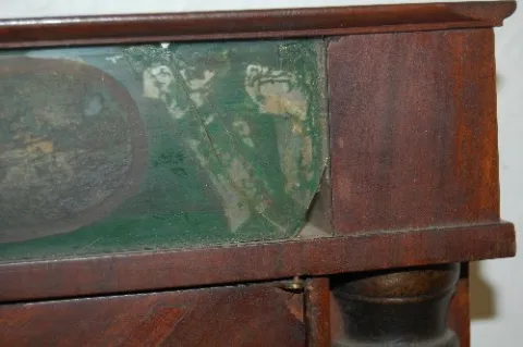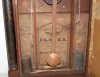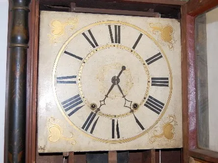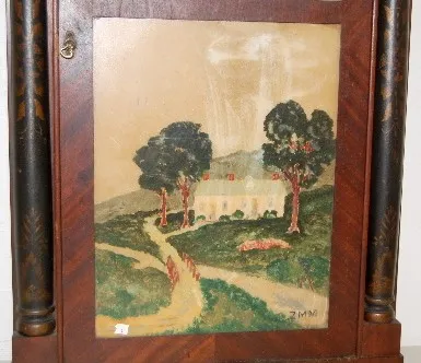 wooden works; with weight and pendulum. (Upper glass is broken; door hinge is loose.) This lot is in rough, as is, as found condition....