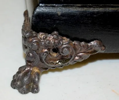 8 day time and strike; hour and half hour bell strike; 4 1/2" marked paper dial; marked movement; no pendulum or key; black enamel case with brass bel...