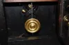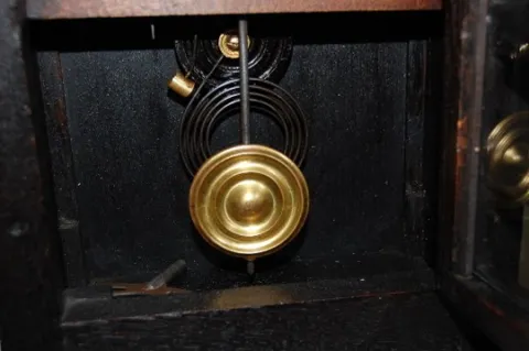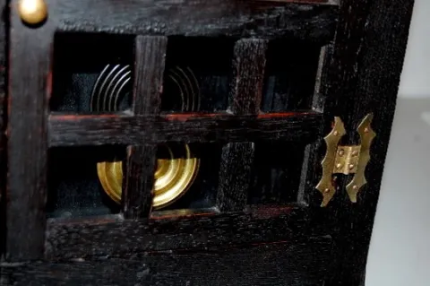 8 day time and strike; metal numbers; has key and pendulum; 7 1/2" dial; hour and half hour gong strike. 18 1/8" and running at this time...