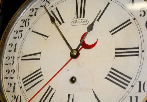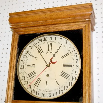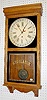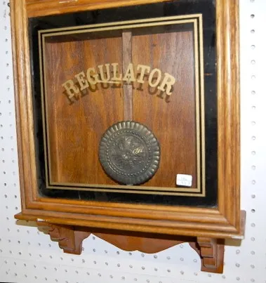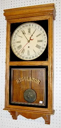time date; marked painted tin dial; has pendulum; painted top and bottom glass, with "Regulator" on the bottom glass; not tested for running condition...