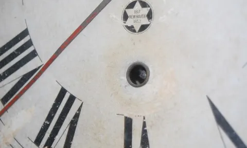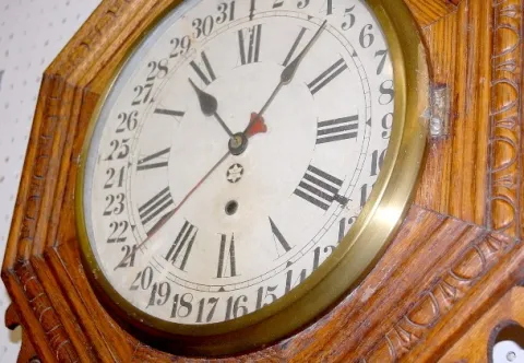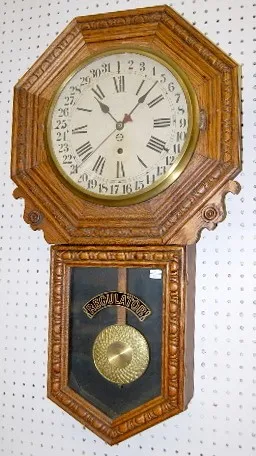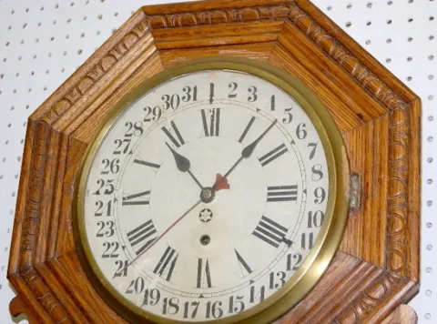 New Haven Carved Oak Calendar Schoolhouse Clock