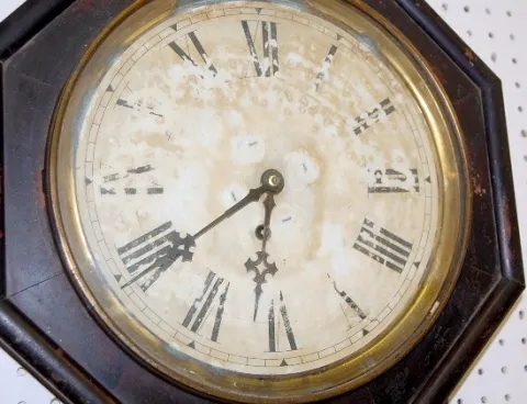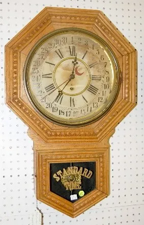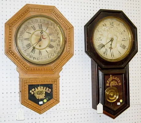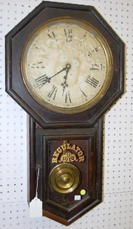 1.) Ingraham Mahogany Octagon Long Drop Regulator: time only; has key and pendulum; 11" paper dial; lower door has painted "Regulator" and design on i...