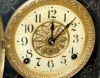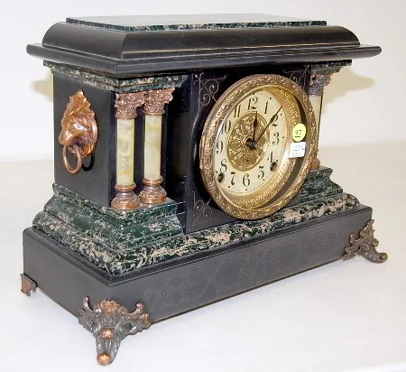 time and strike; 4" marked paper dial; marked movement; has pendulum; no key; lion heads on sides and metal feet; winds and runs; beveled glass in doo...
