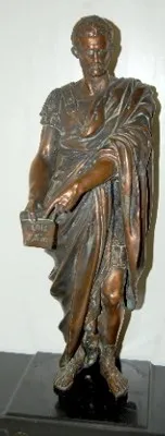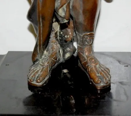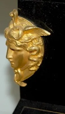 ornate bronze dial and trim; w/ lady heads; copper patina. (Male Roman statue has been married to clock, not attached.) 26"...
