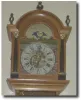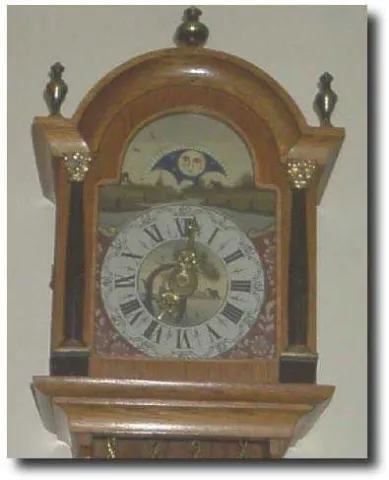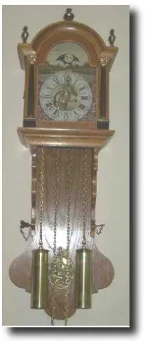 Dutch Weight Driven Friese Start Clock Dutch Friese weight driven start clock with moondial. the clock chimes on the half and full hour. Weight driven by two long shaped brass weights. The dail is handpainted with a typical Dutch landscape. Measures approx. 28" long 9" wide and 5.25" deep. The pendulum hangs inside the case, you can see the pendulum through the brass ornament. The clock is in great shape.